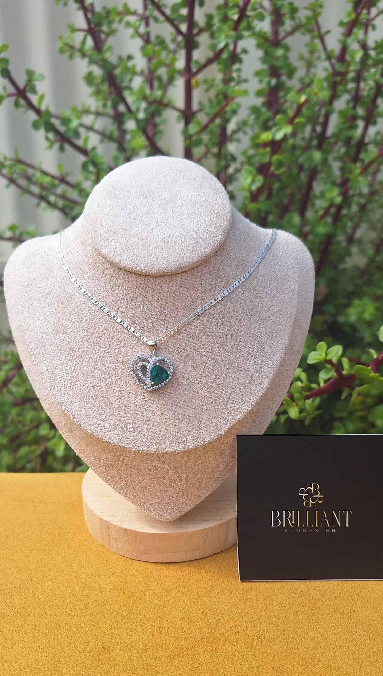 This gorgeous heart-shaped pendant features a natural Colombian emerald, embraced by sparkling white stones, symbolizing love and sophistication. Paired with a 45 cm sterling silver chain, it’s the perfect accessory for any occasion.